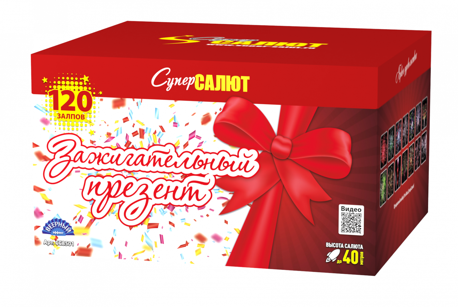 Характеристики батареи салютов СуперСалют Зажигательный презент СС8501
