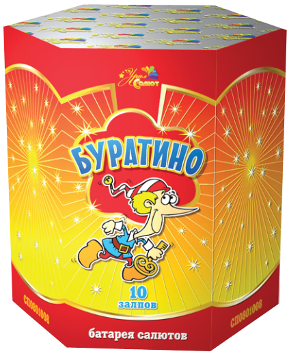 В Буратино входит десять залпов: рубиновые кометы, разлетающиеся небесно-голубыми жемчужинами с серебристыми маленькими рыбками, изумрудные кометы, разлетающиеся небесно-голубыми жемчужинами с золотистым, рубиновые кометы, расцветающие рубиновыми жемчужинами с серебристым мерцанием, изумрудные кометы, разлетающиеся с эффектным треском.