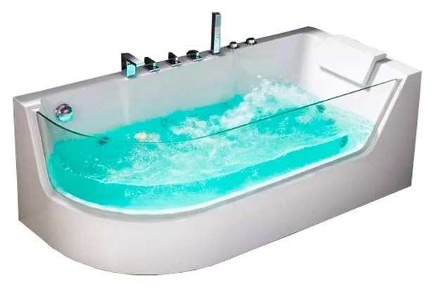 - Особенности — смеситель в комплекте, установка на каркас, подголовник, стеклянная вставка