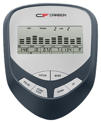 Тренировочный компьютер представлен черно-белым LCD-дисплеем диагональю 14.5 см. с профилем тренировки. В программный пакет входят 8 предустановленных программ, направленных на тренировку скоростных качеств, выносливости, укрепления сердечно-сосудистой системы и похудания. Помимо предустановленных программ, можно воспользоваться самостоятельно регулируемым ручным режимом, а также создать 4 собственные программы. Для тренировок с контролем пульса существуют 4 пульсозависимые программы с предустановленными значениями 60%, 75% и 85% и 100% от целевого максимального пульса. Эргонометрическая функция (ватты) позволяет зафиксировать необходимый уровень нагрузки – он останется постоянным вне зависимости от скорости вращения педалей. Оценить состояние своего организма можно по таким показателям как BMR (Индекс метаболизма), BMI (Индекс массы тела ) и Body Type (тип телосложения). По завершении тренировки функция Recovery оценит способность сердечно-сосудистой системы к восстановлению.