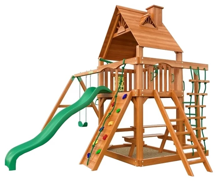 - Изготавливается из качественного износостойкого материала – древесины, покрытой специальным защитным средством. - Благодаря усиленным комплектующим от американского производителя родители могут быть уверены о безопасности ребёнка. - Престижная конструкция прекрасно смотрится рядом с загородным коттеджем. - Играть на детской площадке может сразу пятеро детей, что позволяет ребятам выработать социальную адаптацию в обществе. - Интересный дизайн привлекает внимание ребёнка, стимулируя его поиграть на свежем воздухе. - Продуманная игровая конструкция способствует физическому развитию деток.