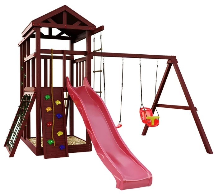В данной модели собраны элементы для активны игр на свежем воздухе. Волновая горка, навесная лестница, сетка, по которой можно взобраться на второй уровень, турники и качели – ваш ребёнок будет в восторге и обязательно захочет пригласить друзей для ещё большего веселья.