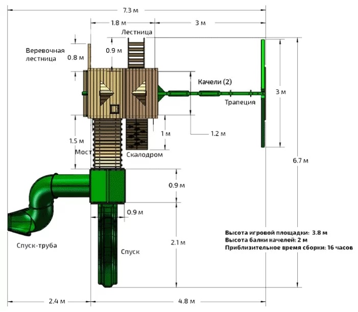 Детский игровой комплекс Атлант выполнен из обработанного антисептическими составами качественного дерева, стойкого к воздействиям влаги и ультрафиолета. Детский игровой комплекс с применением оригинальных компонентов откроет для детей возможность интересно и с пользой проводить время на улице. Подвесной мост, разновидные качели, скалодром являются хорошими тренажерами для детского вестибулярного аппарата и помогут ребенку стать активным и выносливым. Элементы в виде башни делают детскую игру более сказочной и захватывающей.