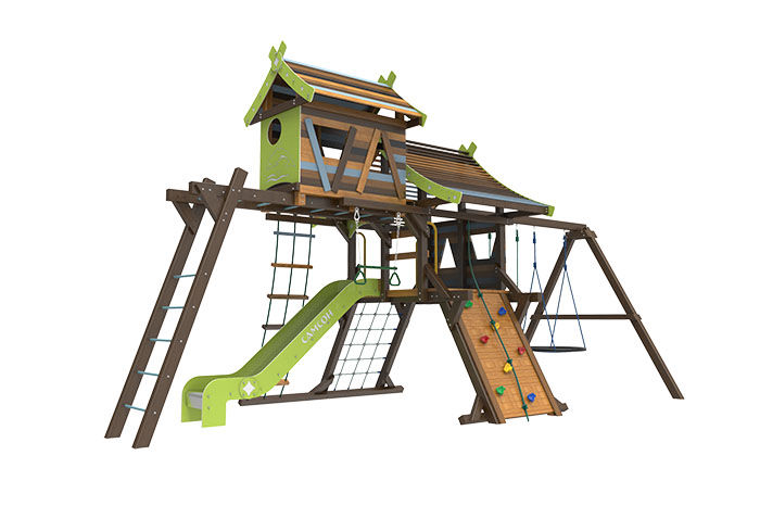 Яркая и красочная, многоуровневая площадка для игр Самсон Хижина Аквитания станет не только прекрасным украшением любого частного дворика или участка, но и любим развлечением детворы на открытом воздухе. Какой ребёнок не любит покататься на качелях, полазить по лестницам или скалодромам, съехаться пару раз с горки или просто повисеть на перекладине? Тем более, что для этого не нужна куда-то ходить или ездить.