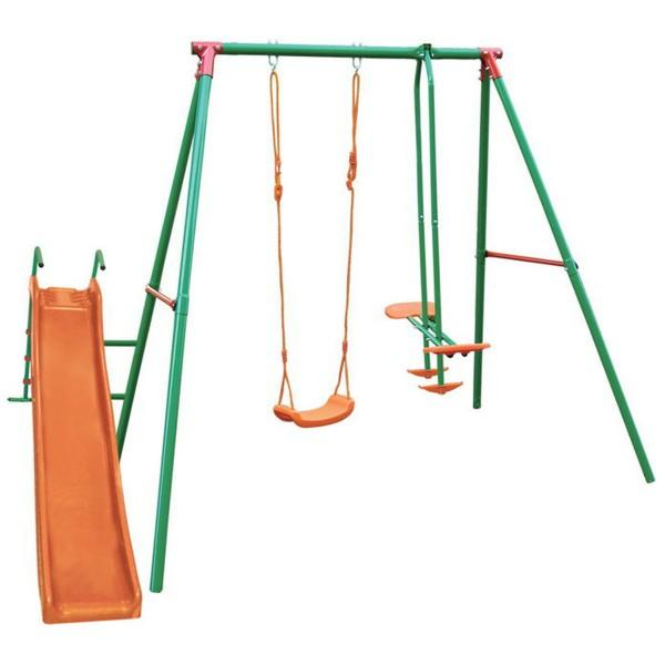 - Состав комплекса — качели, горка, двухместные качели