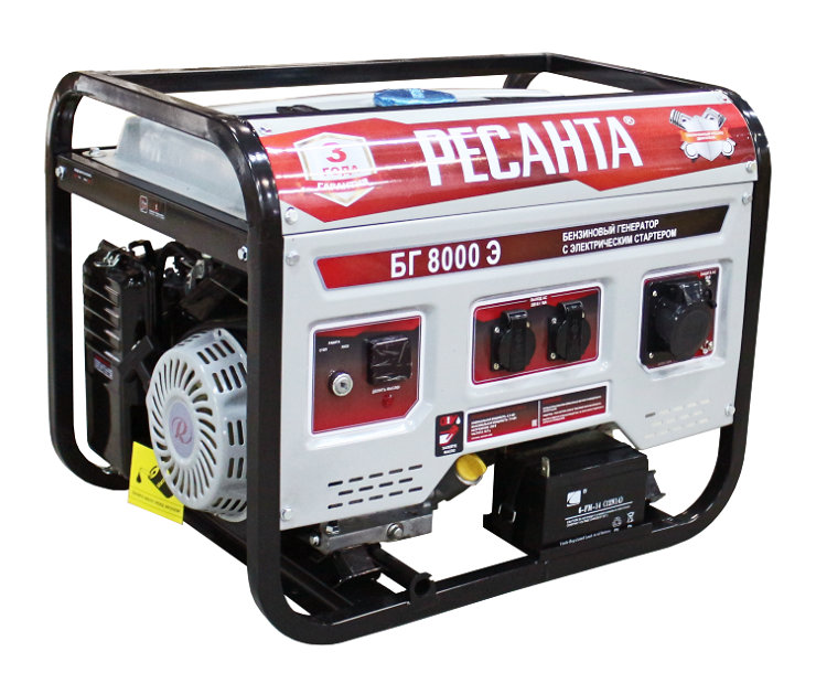 Электрогенератор Ресанта БГ 8000 Э предназначен для автономного электроснабжения потребителей бытового назначения. Электрогенератор бензиновый однофазный, выходная мощность 6500 Вт, выходное напряжение 220 Вольт. В качестве первичного двигателя используется карбюраторный двигатель, топливом для которого является неэтилированный бензин. Так же генератор оснащен выходом постоянного тока (12В), предназначенным для зарядки аккумуляторных батарей.