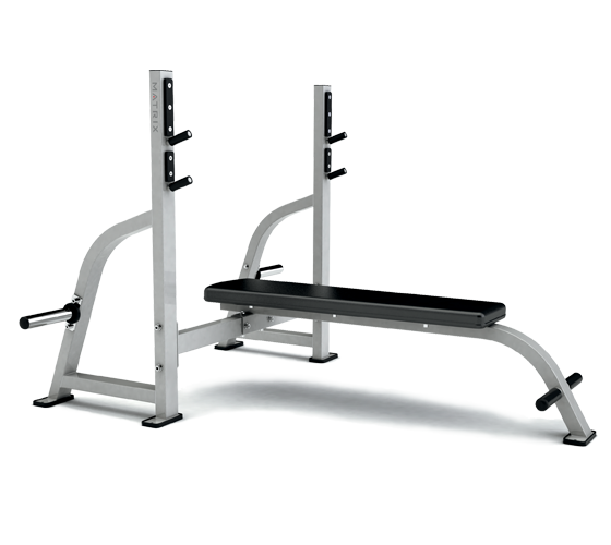Скамья со стойками горизонтальная. Наклонные стойки для удобства жима и большей стабильности. Держатели под олимпийские диски.