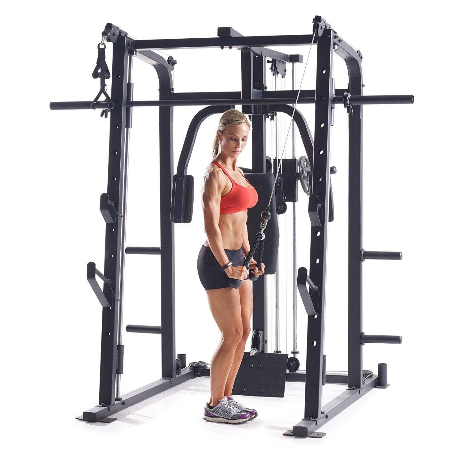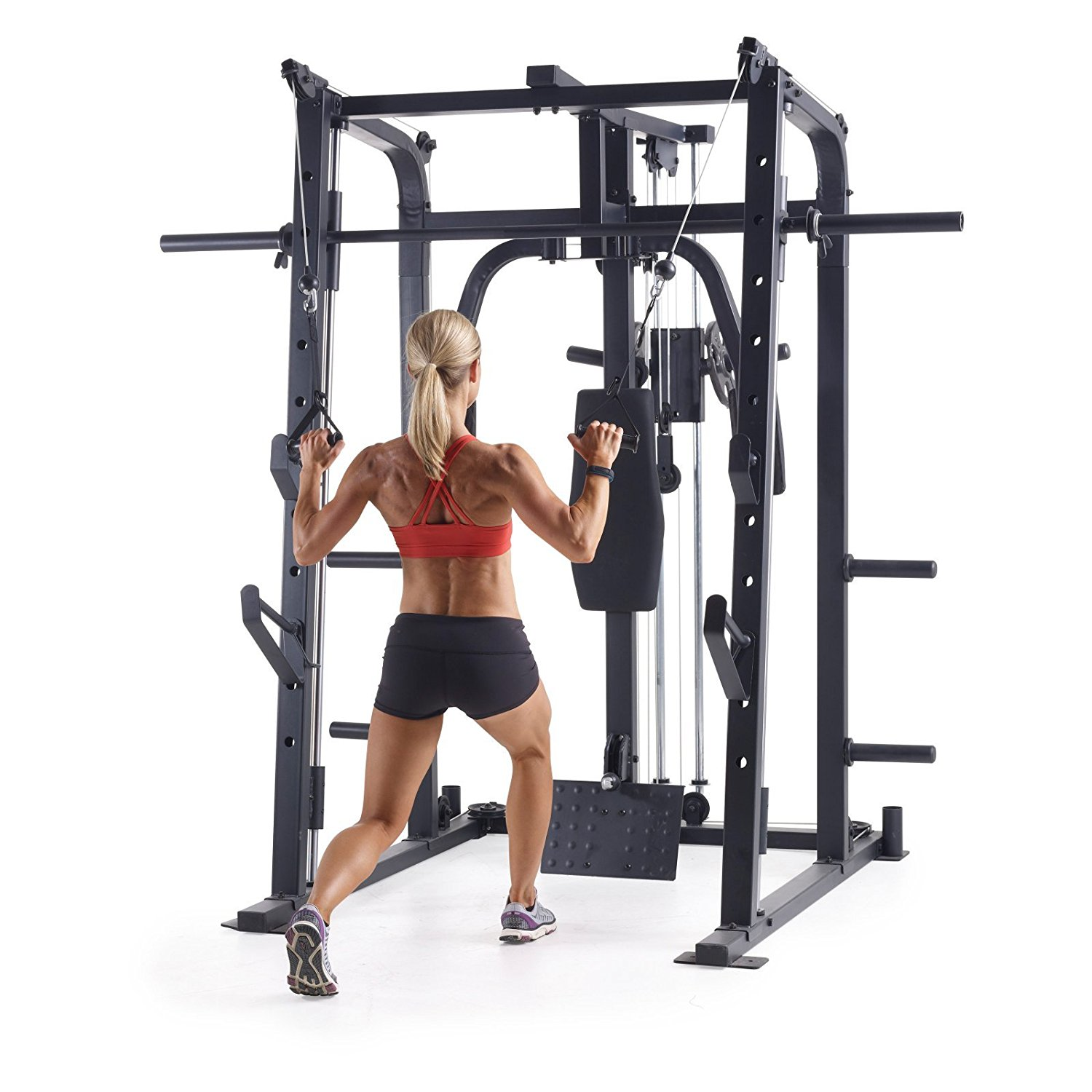 В комплекте опции для выполнения различных силовых упражнений: Машина Смита, тяга сверху / снизу, баттерфляй, парта для бицепса, жим ногами, жим лежа на скамье дополнительной штанги (опция).